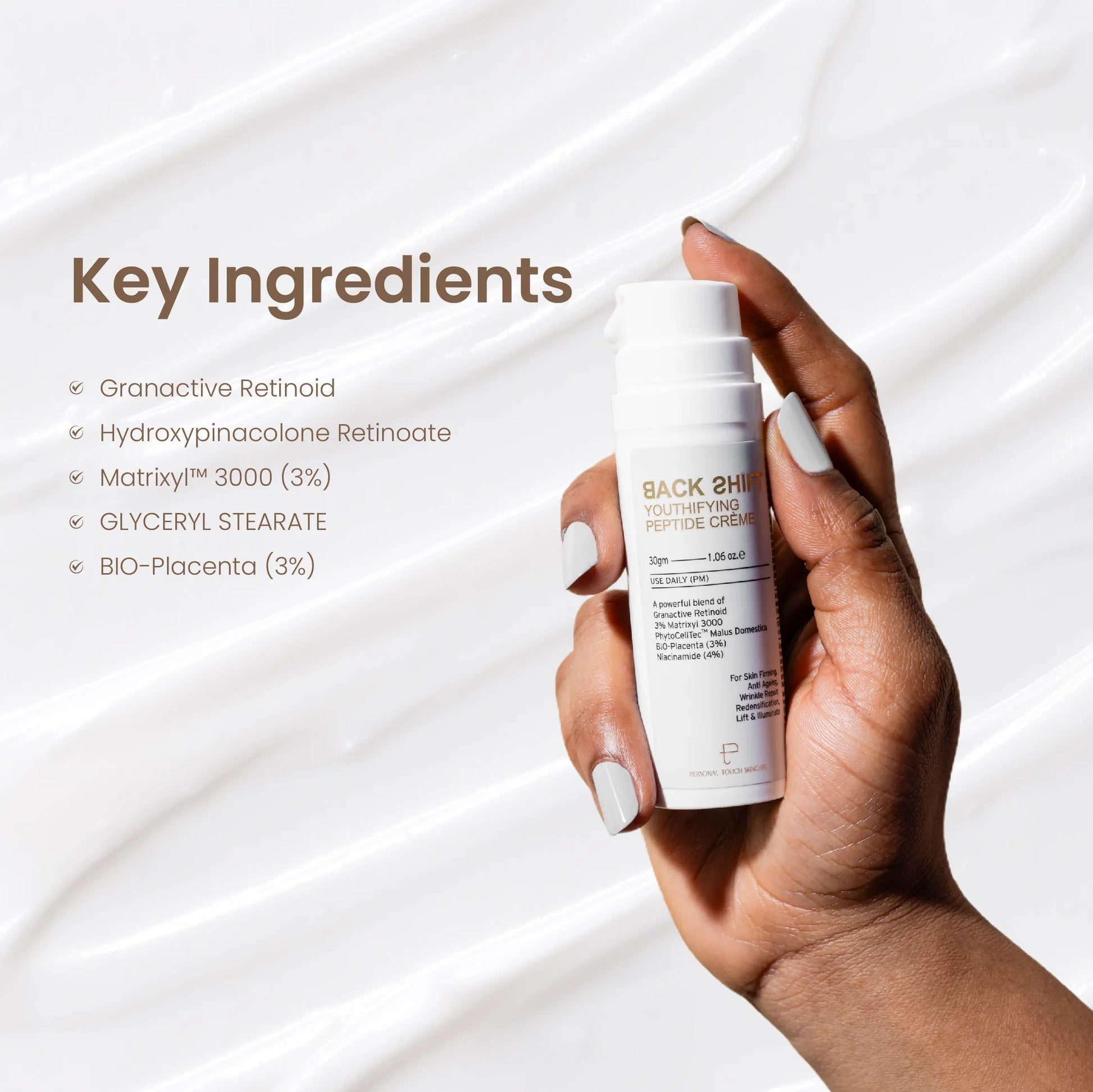 Backshift is an advanced anti-aging treatment designed to combat fine lines, wrinkles, and uneven texture, restoring youthful, plump skin. Formulated with 0.3% Granactive Retinoid, a stable, non-irritating retinoid that boosts cell turnover and collagen production, it improves skin texture and tone within 14 days. Enhanced with Hydroxypinacolone Retinoate and PhytoCellTec™ Malus Domestica, this lightweight cream supports skin regeneration and firmness. It also features BIO-Placenta, which mimics growth factors to reduce wrinkle depth, and Matrixyl™ 3000, a peptide blend that stimulates collagen synthesis and skin repair. Niacinamide further brightens, hydrates, and reduces redness, making Backshift a comprehensive solution for youthful, revitalized skin.