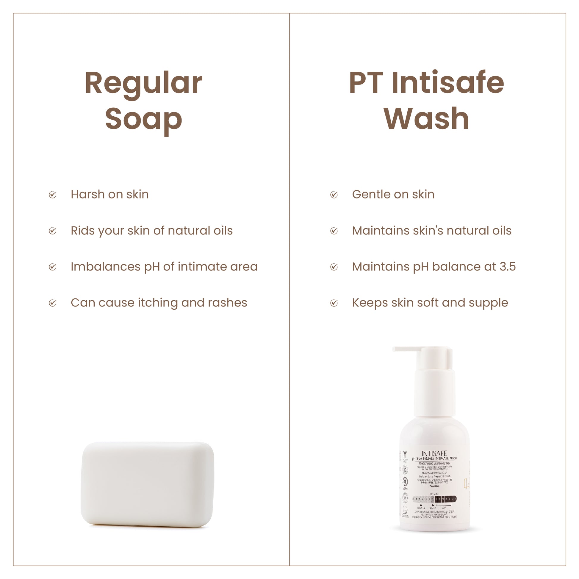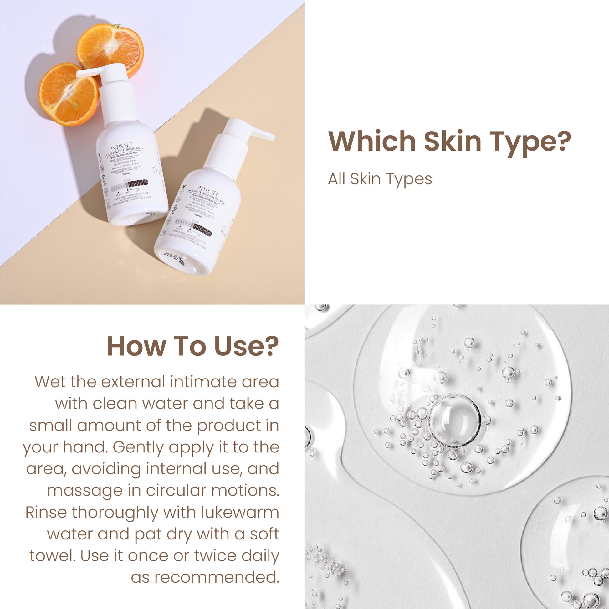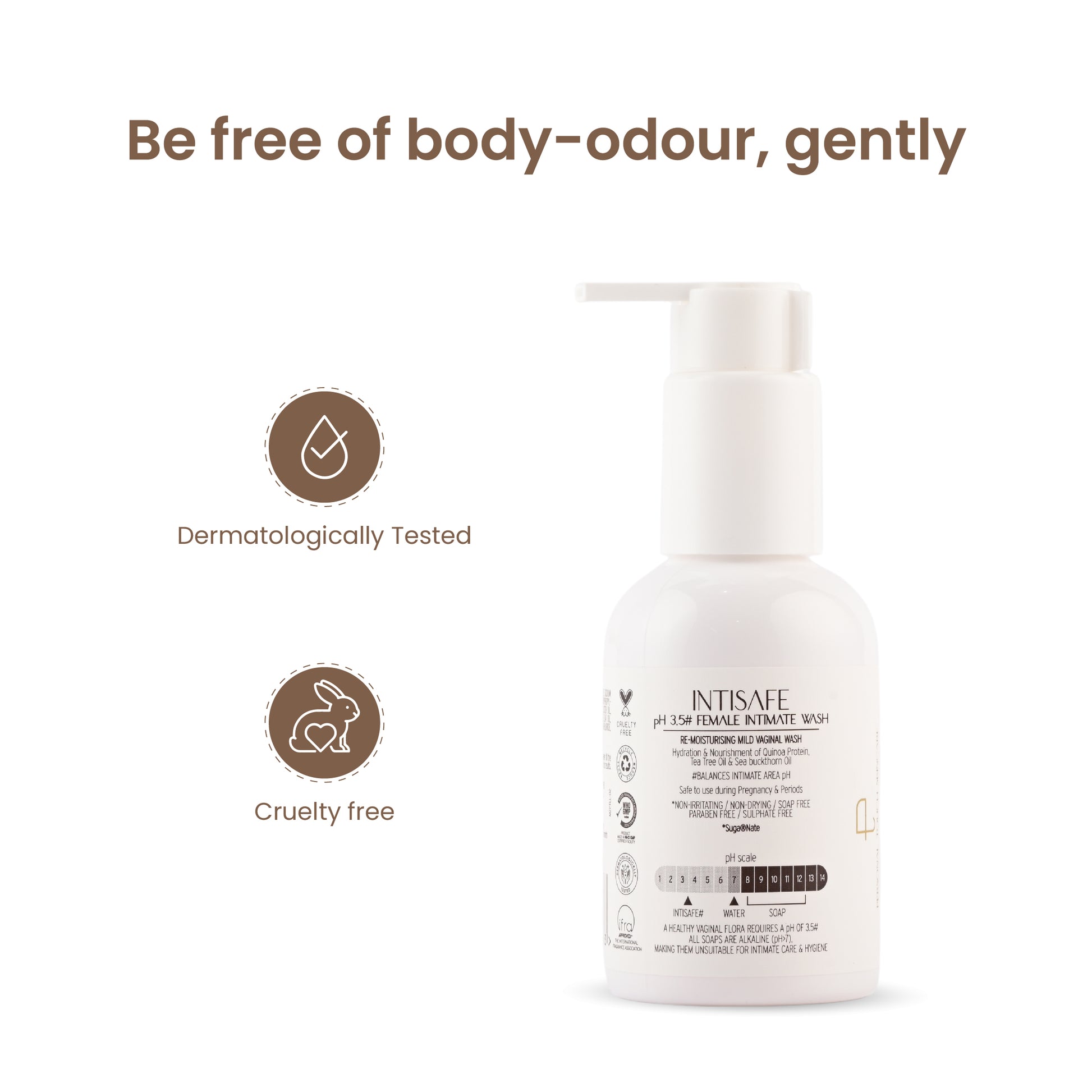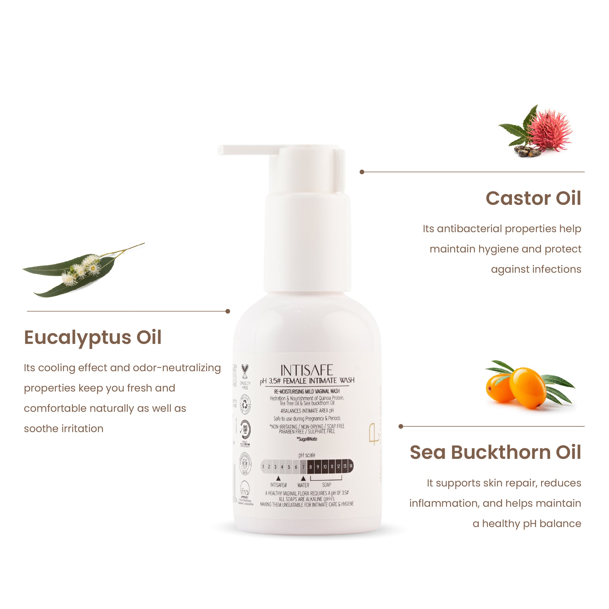 Maintain intimate hygiene with Intisafe Wash, a pH 3.5 balanced, soap-free, and non-irritating formula designed to cleanse gently without stripping moisture. Infused with Quinoa Protein, Tea Tree Oil, and Sea Buckthorn Oil, it provides deep hydration, nourishment, and protection, ensuring comfort and freshness throughout the day.